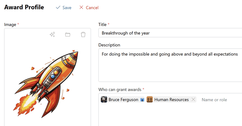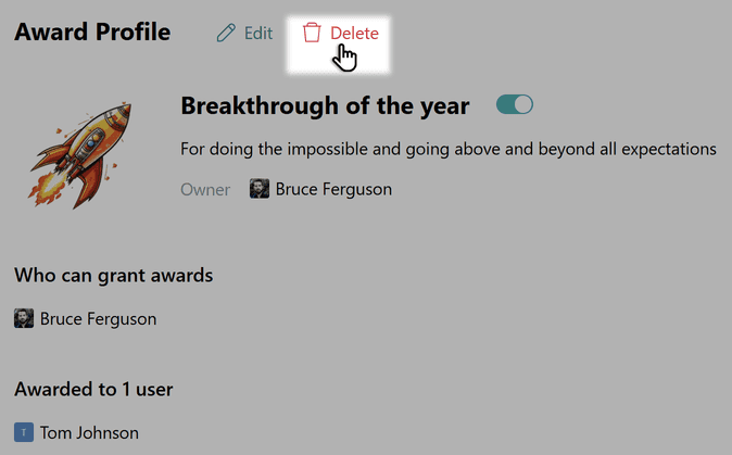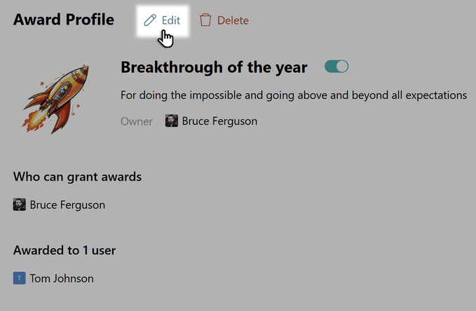 If you need to change the name, description, image of the award, or the employees who can grant it, click Edit in the profile and make the necessary adjustments.