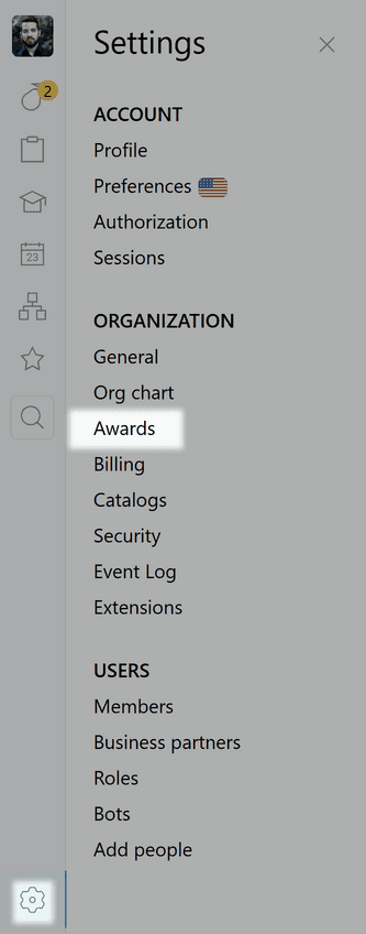 By default, only employees with Organization Manager rights can create, remove, or disable awards, or change their name, description and image. But you can grant these rights to all your colleagues in the Organization settings in the Security section.