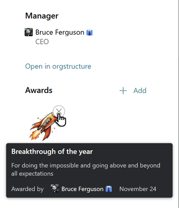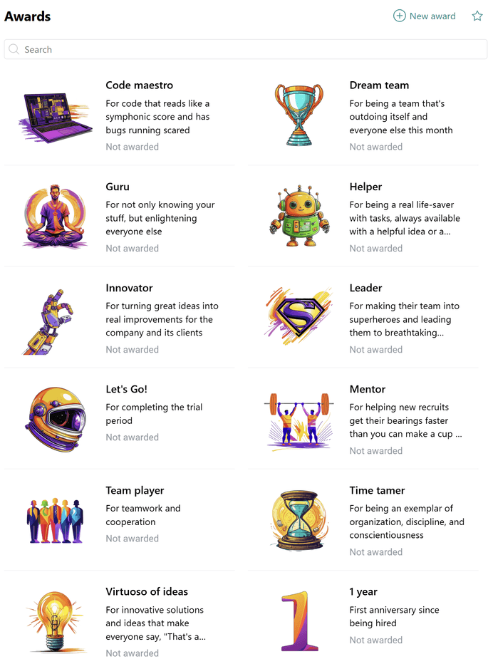 The awards page is visible to all users in your organization. A number of awards are pre-installed initially, but you can add your own badges to highlight the features of your specific corporate culture.