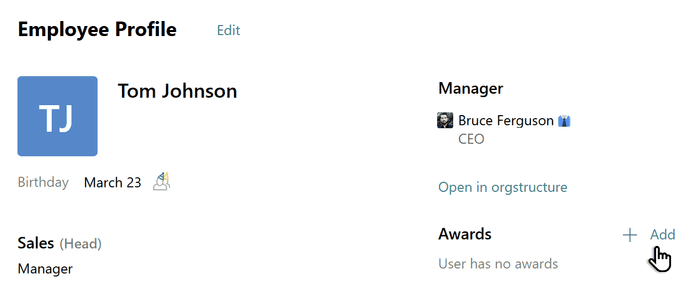An employee with the right to grant awards opens their colleague’s profile, and clicks Add in the Awards block.