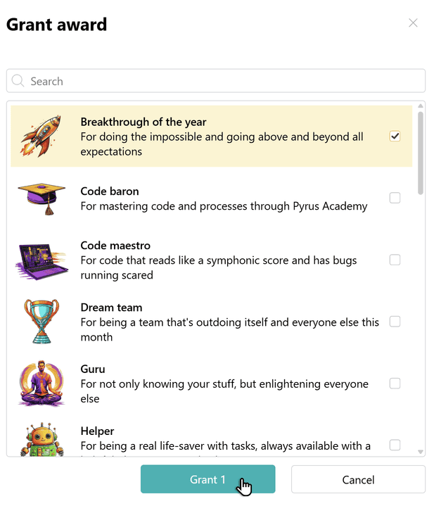 In Pyrus, employees can be presented with awards for achievements at work, loyalty to the company, leadership and communication skills, etc.