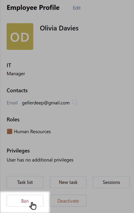 Sometimes it may be necessary to temporarily restrict an employee's access to tasks, processes, and company data in Pyrus, for example, during an internal investigation. During this process, the employee remains logged in to Pyrus, and all tasks in which they are assignee or participant remain accessible. You can ban and restore an employee on their profile page.
