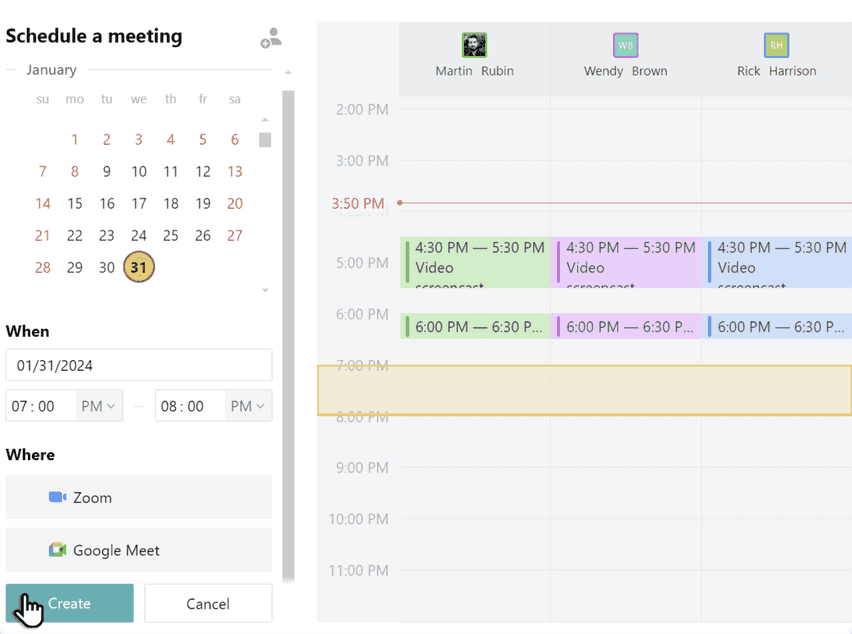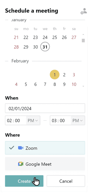 In the panel that opens, enter a date and time for your meeting. To specify a duration, drag your cursor from the beginning time to the end time. The selected time interval will be displayed on the right side of the block. Click Create.
