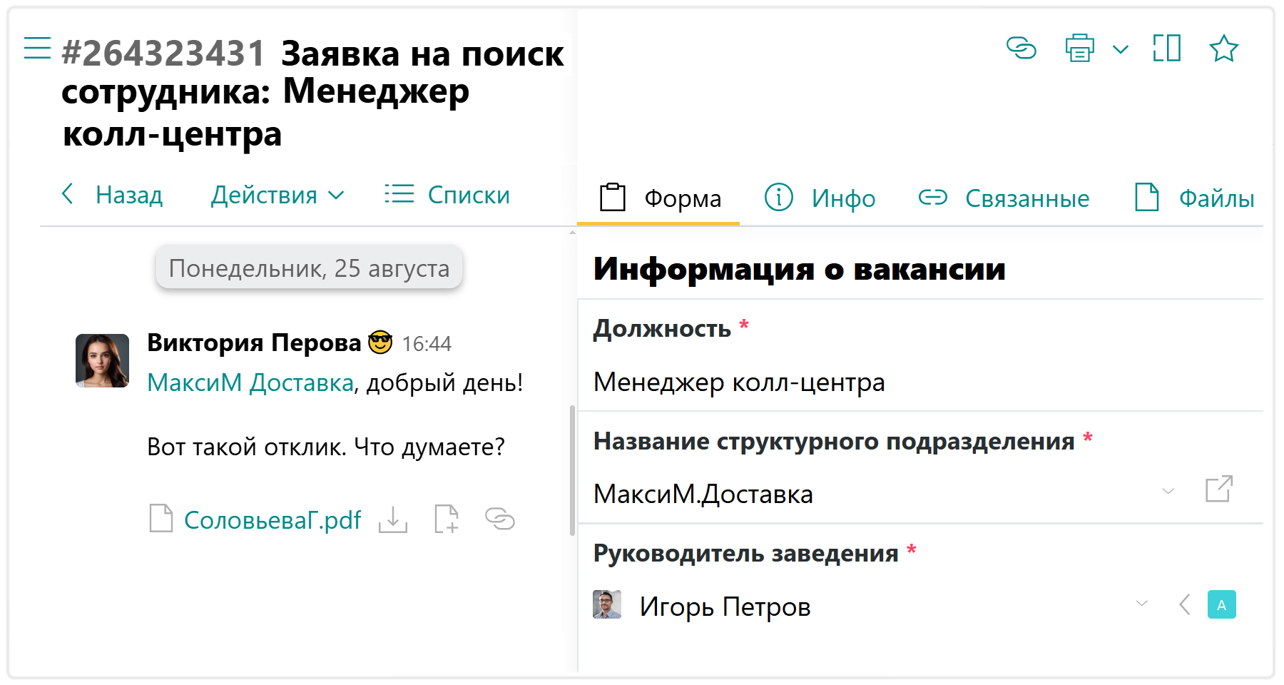 Все начинается с «Заявки на поиск сотрудника». Ее заполняет управляющий рестораном или потенциальный руководитель: