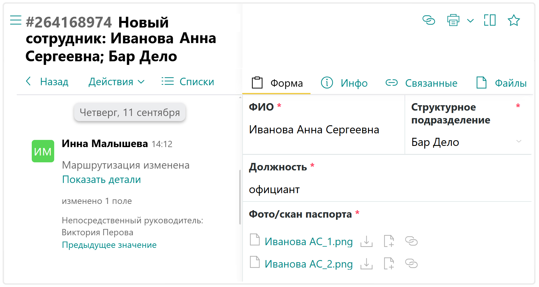Когда кандидата приняли, заводят карточку по форме «Новый сотрудник»: заполняют все данные и прикладывают сканы документов. После чего сотрудник приходит в офис и подписывает документы.