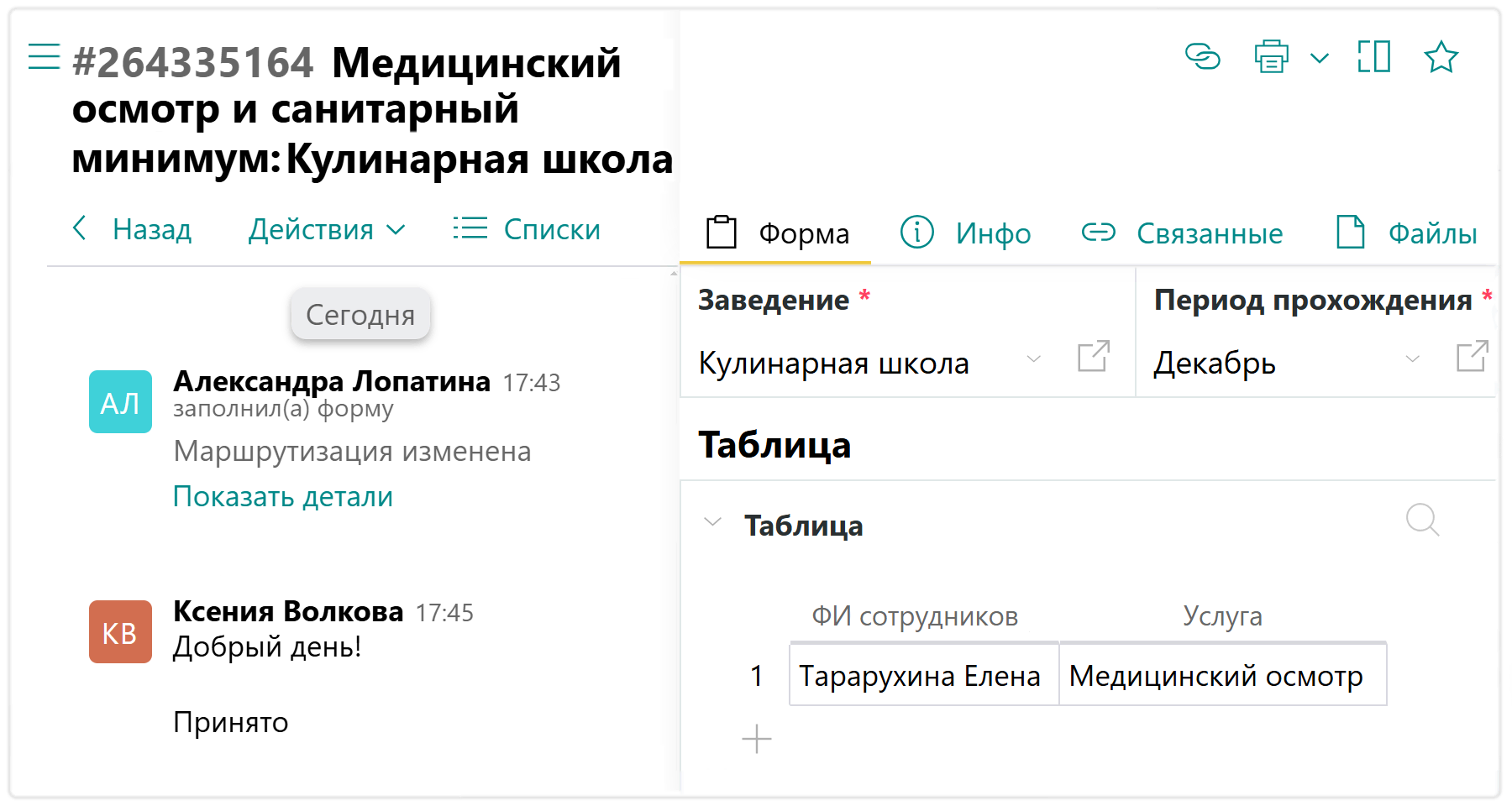 И медкнижек: управляющие отправляют заявки, чтобы сотруднику назначили медосмотр, а потом прикладывают данные по результатам. При этом сотрудник получит сообщение о записи, подробные инструкции, а затем — уведомление о том, когда можно забрать медкнижку.