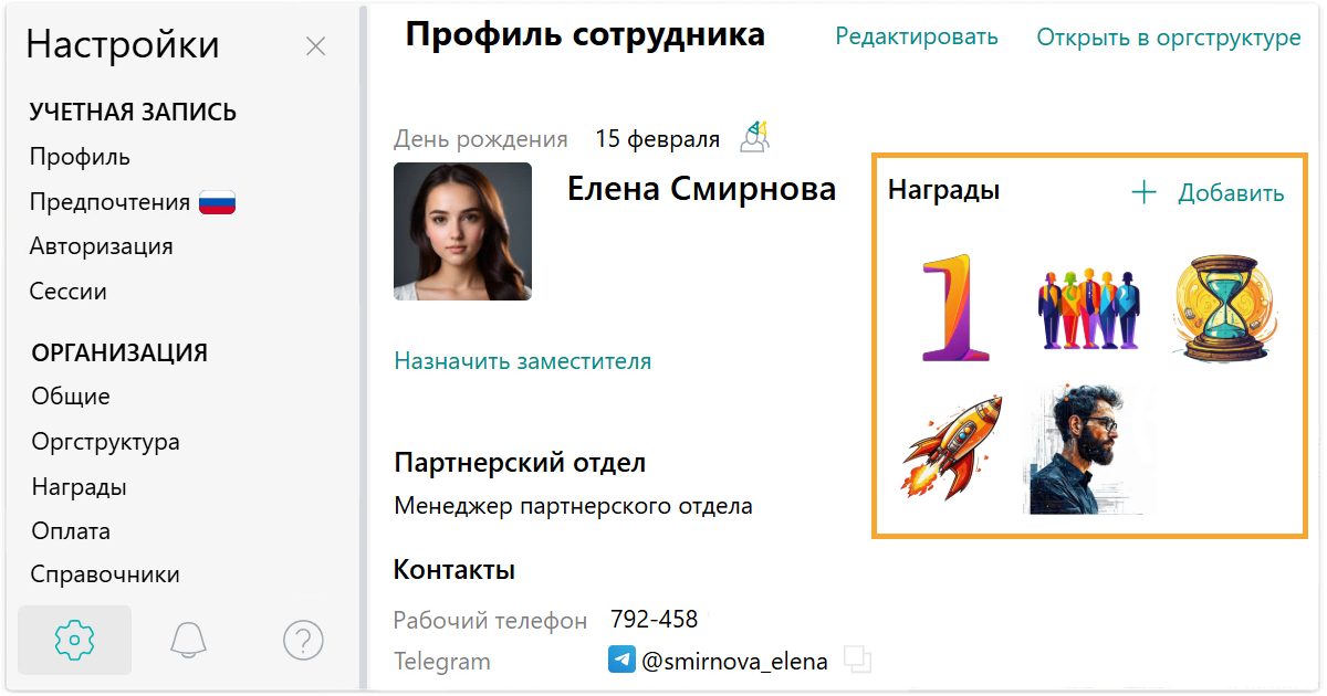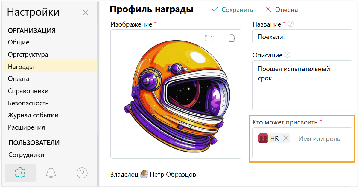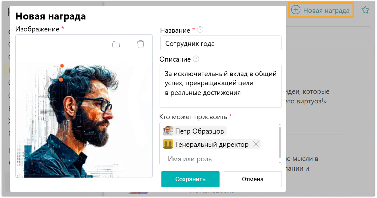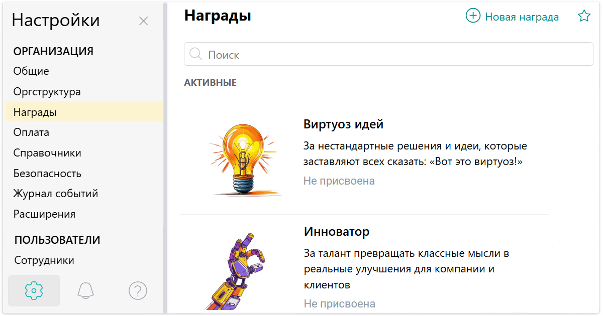 Раздел доступен в меню настроек на левой панели. В нем размещены предустановленные награды, которые можно использовать сразу после подключения. Чтобы подчеркнуть корпоративную культуру компании, вы можете добавить собственные и установить для них любое изображение.