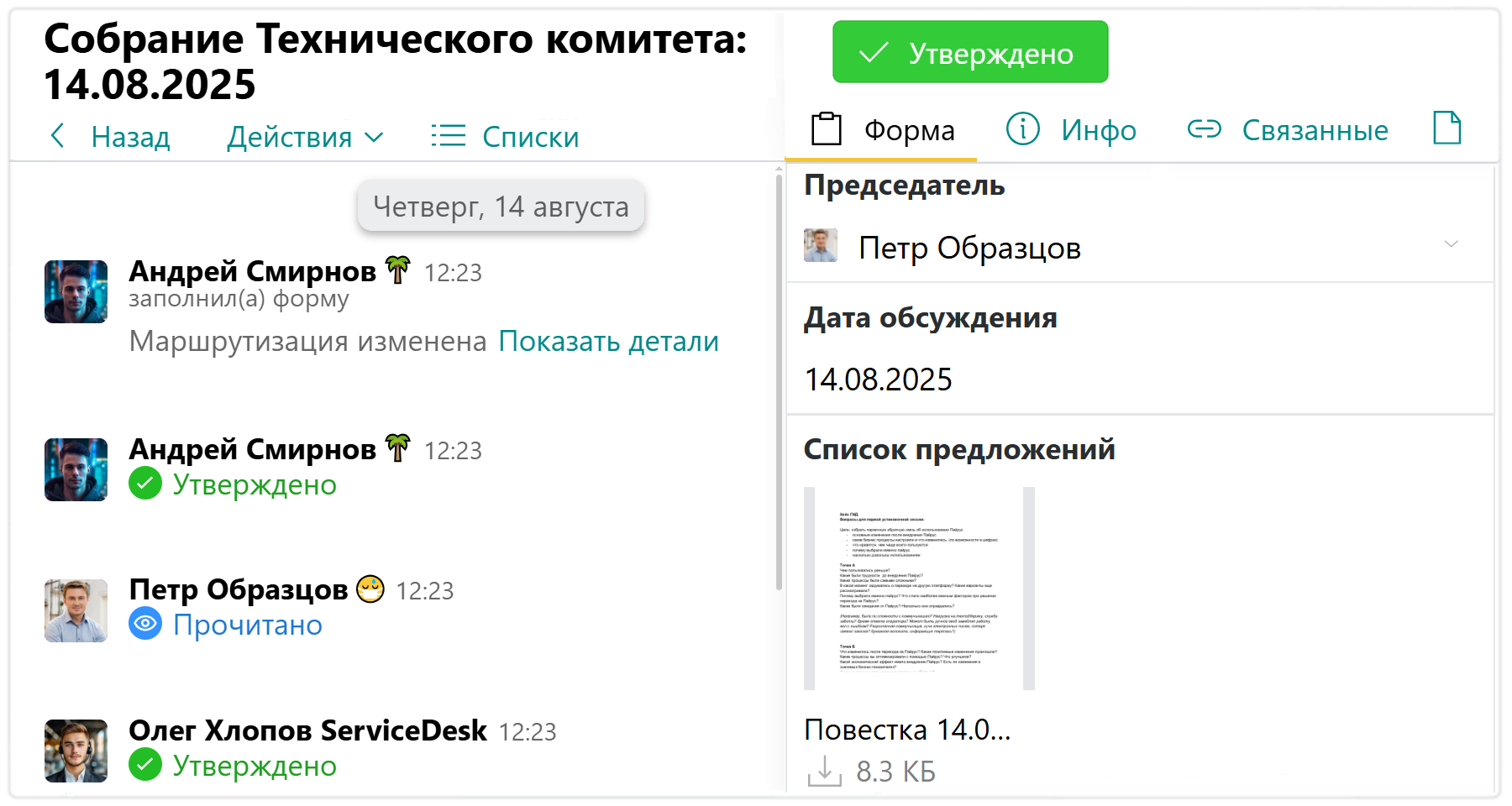 Это подходит для регулярных процессов, например, когда технический комитет раз в неделю утверждает закупки, бюджетные корректировки или решения о внедрении новых информационных систем.