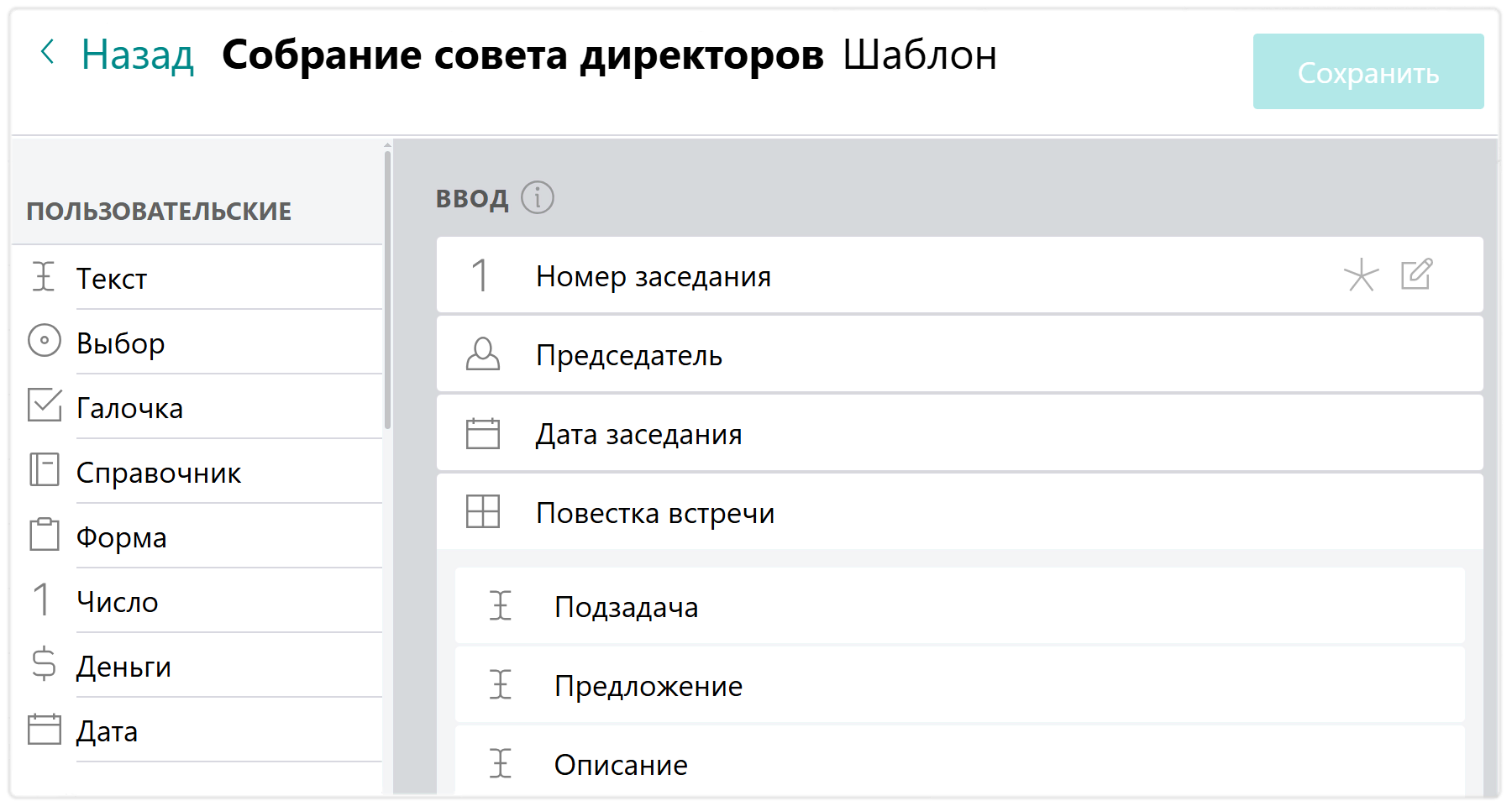 Секретарь начинает с настройки Формы. В Шаблоне он добавляет необходимые поля ("Номер заседания", "Председатель", "Дата заседания" и таблицу "Повестка встречи"). По этому шаблону каждый раз будет заполняться информация о заседании.
