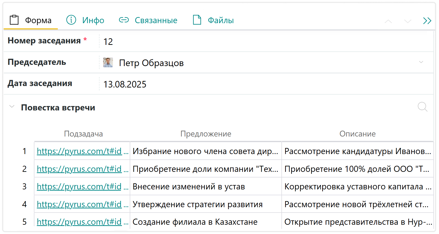 Теперь секретарь создает задачу по этой форме. В ней перечислены все вопросы с кратким описанием, проектом решения, инициаторами и файлами. Затем для каждого пункта создается отдельная подзадача, где могут быть назначены разные участники в зависимости от темы.