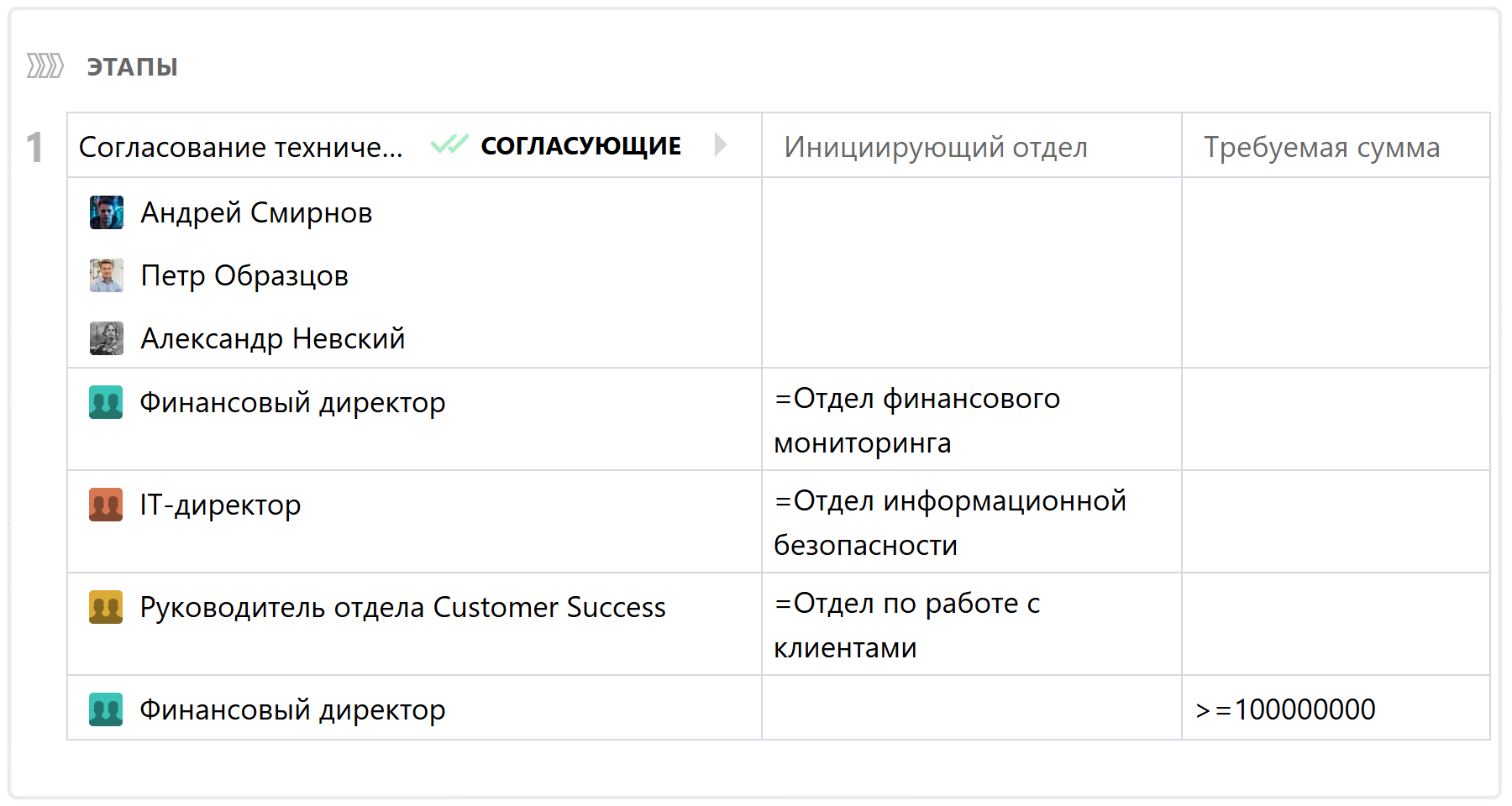 Примером может послужить кредитный комитет. При поступлении заявки система анализирует ее параметры: стандартные кредитные вопросы рассматриваются основным составом. Если предложение было инициировано конкретным отделом или касается изменений в его работе, то добавляется руководитель отдела. Крупные кредитные линии дополнительно попадают на рассмотрение финансовому директору (≥ 100 000 000).
