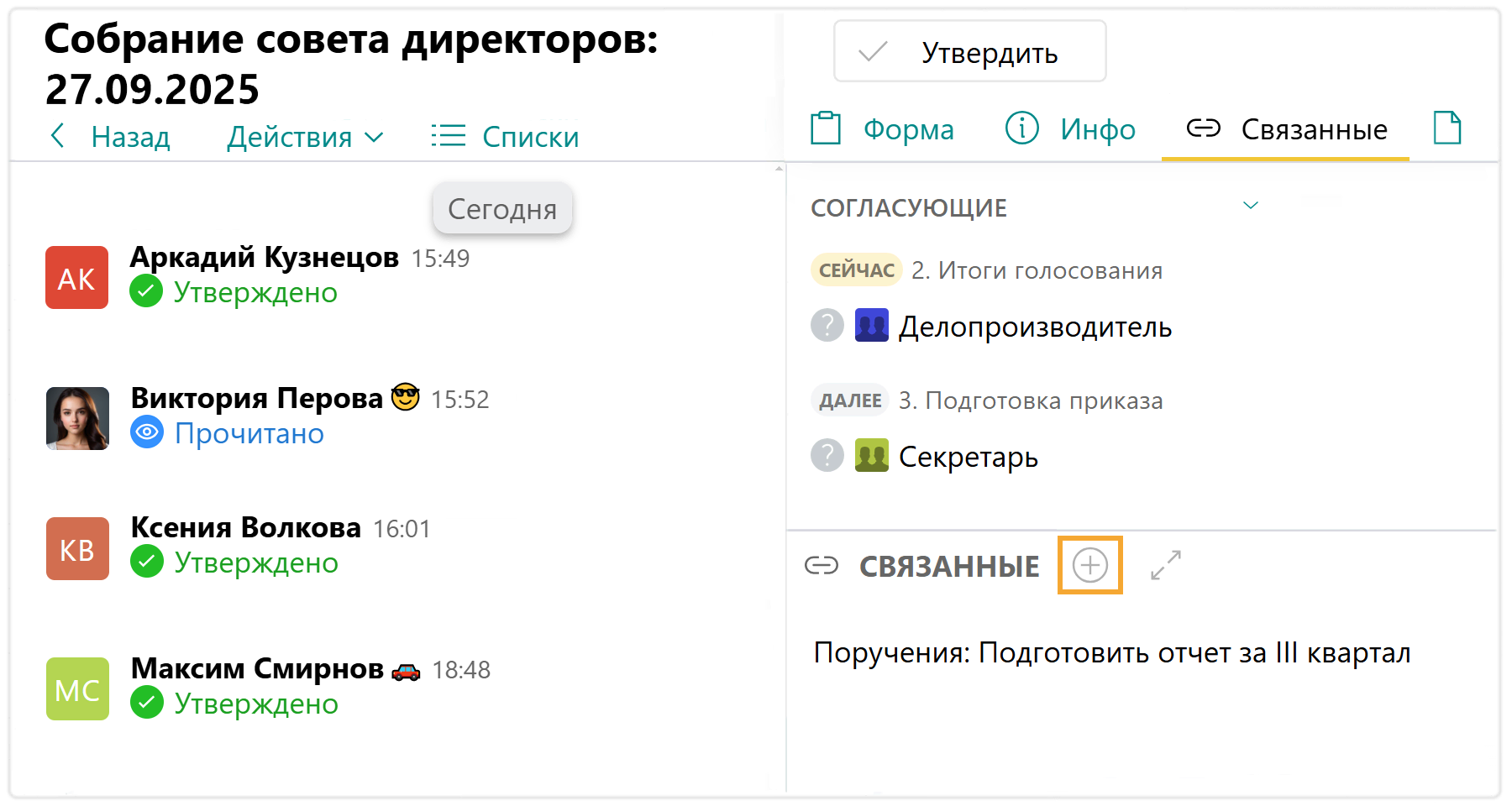 В подзадачах происходит детальное обсуждение: участники комментируют предложения, вносят правки и голосуют за решения. При этом все подзадачи остаются связанными с главной задачей, что позволяет сохранить целостность повестки. После завершения обсуждений секретарь фиксирует итоговые решения в протоколе, который утверждается участниками в первоначальной задаче с общей повесткой встречи.