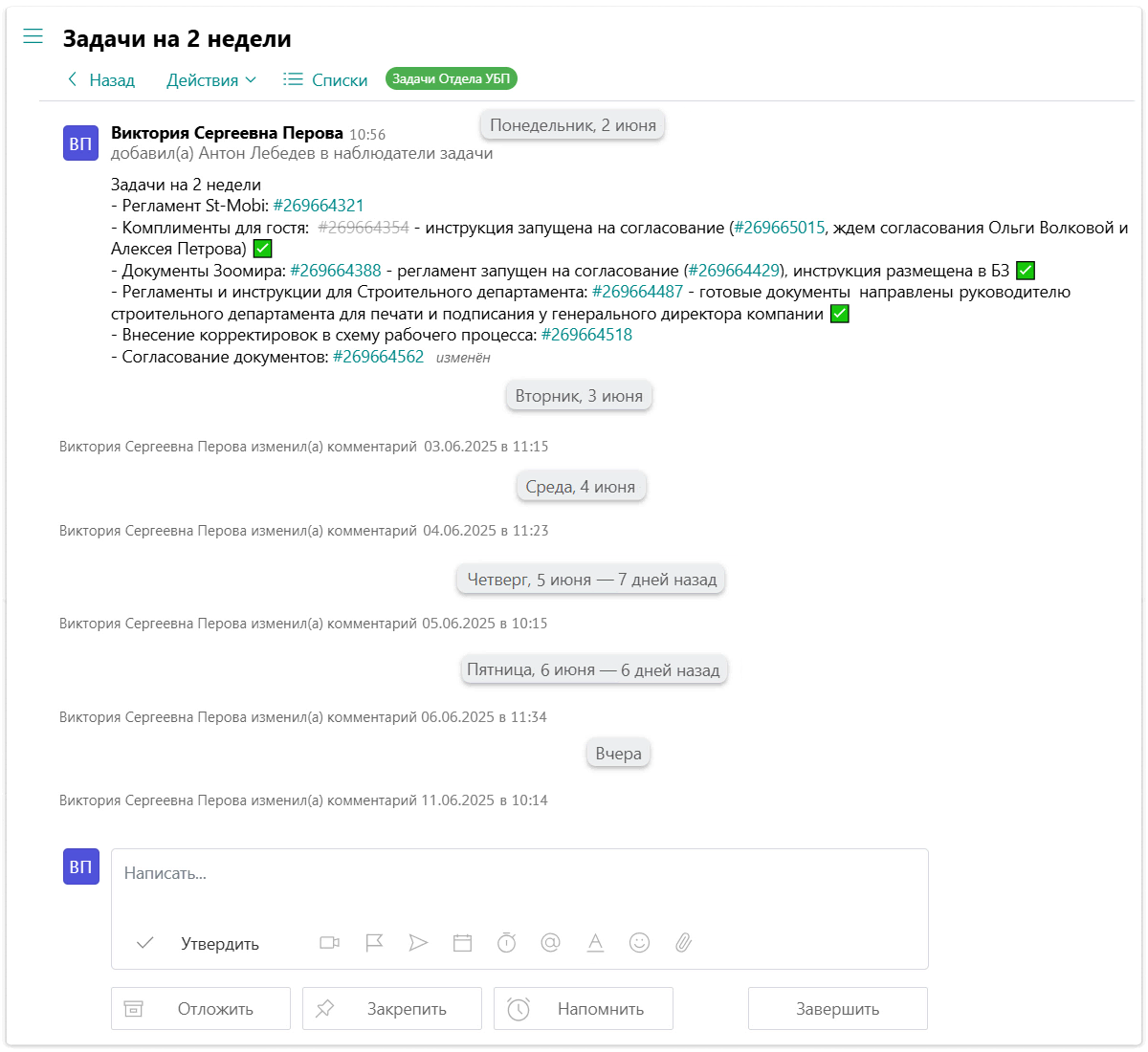 «Например, когда сотрудник переходит из одного отдела в другой, я ставлю задачу: опиши, пожалуйста, все процессы и проекты, которые ты ведешь, все согласования и регламенты. Он прикрепляет ссылки на задачи, включая подпроцессы, и я могу посмотреть, какие задачи закрыты, какие до сих пор в работе и почему, на каком этапе и кто согласовывает.»