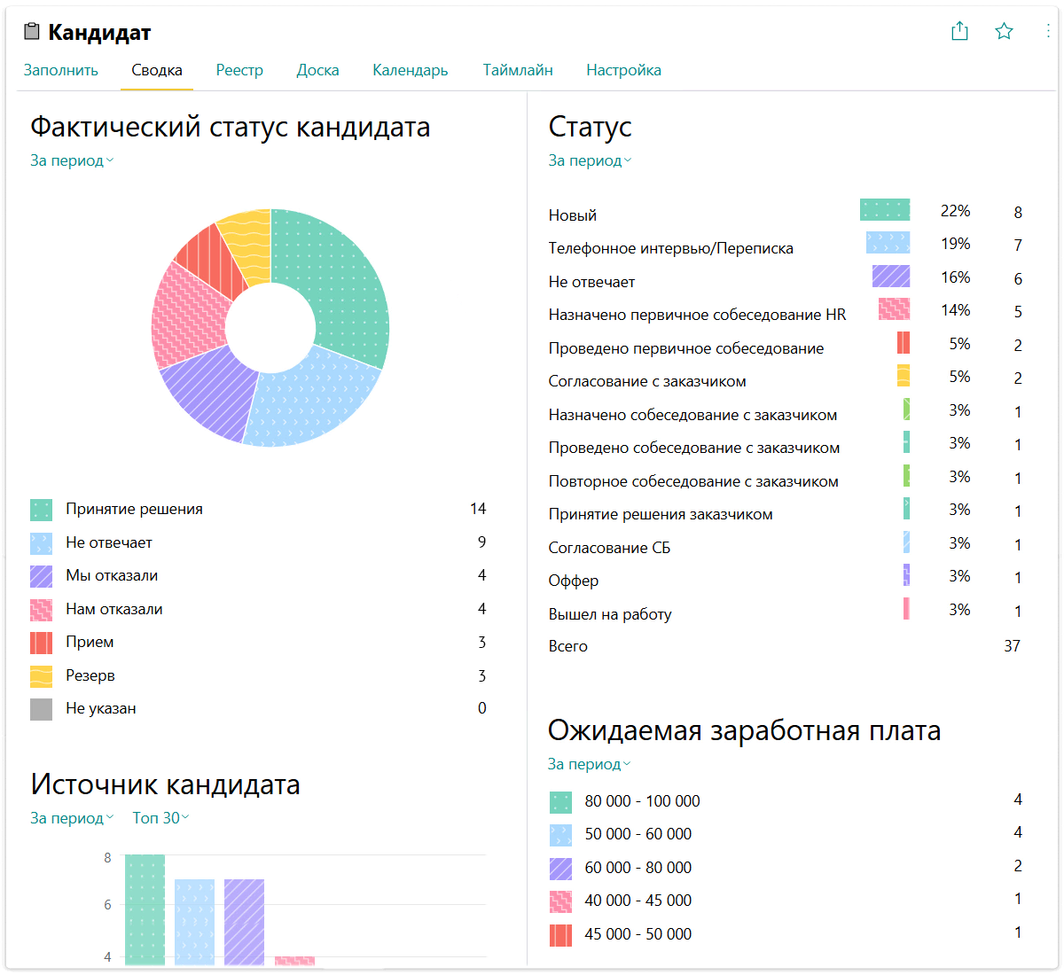 Эффективность процесса отслеживается при помощи сводки за определенный период: в ней видно, сколько задач по кандидатам находится в том или ином статусе, на какую зарплату они рассчитывают, откуда пришли и т.д. Все это помогает оценить загруженность рекрутеров и скорректировать их работу.