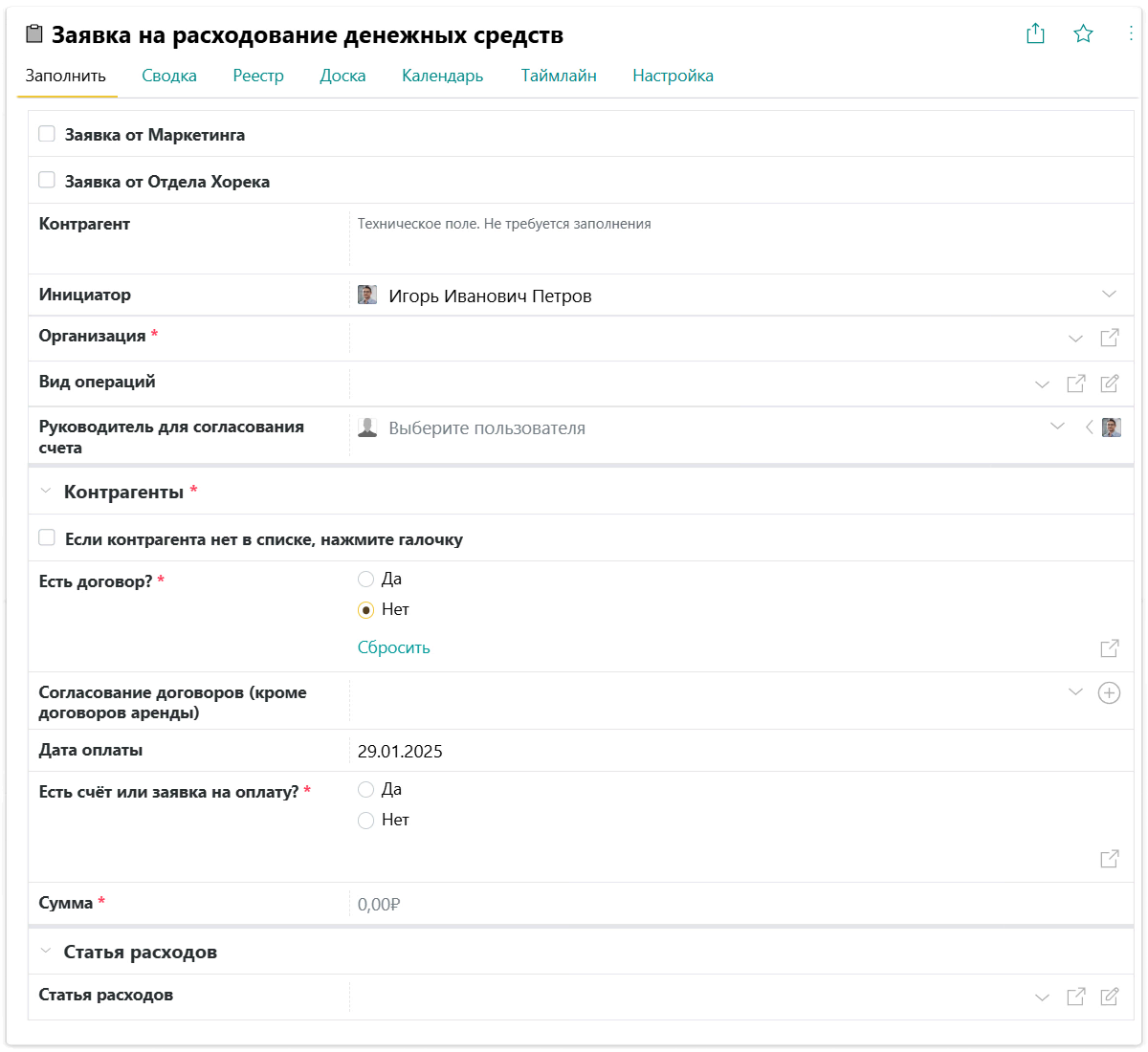 Все оплаты в Human&business проходят согласование через форму «Заявки на расходование денежных средств».