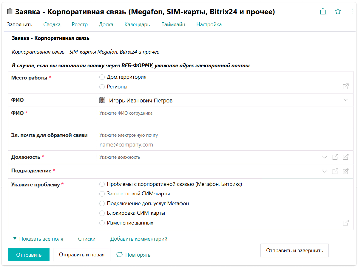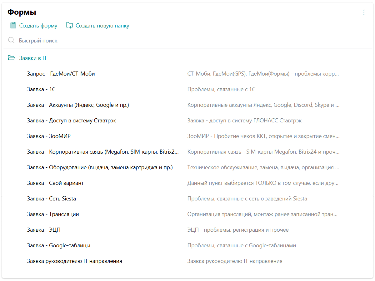 Сотрудники обращаются в техподдержку при помощи форм заявок, где указывают проблему, которую нужно решить.