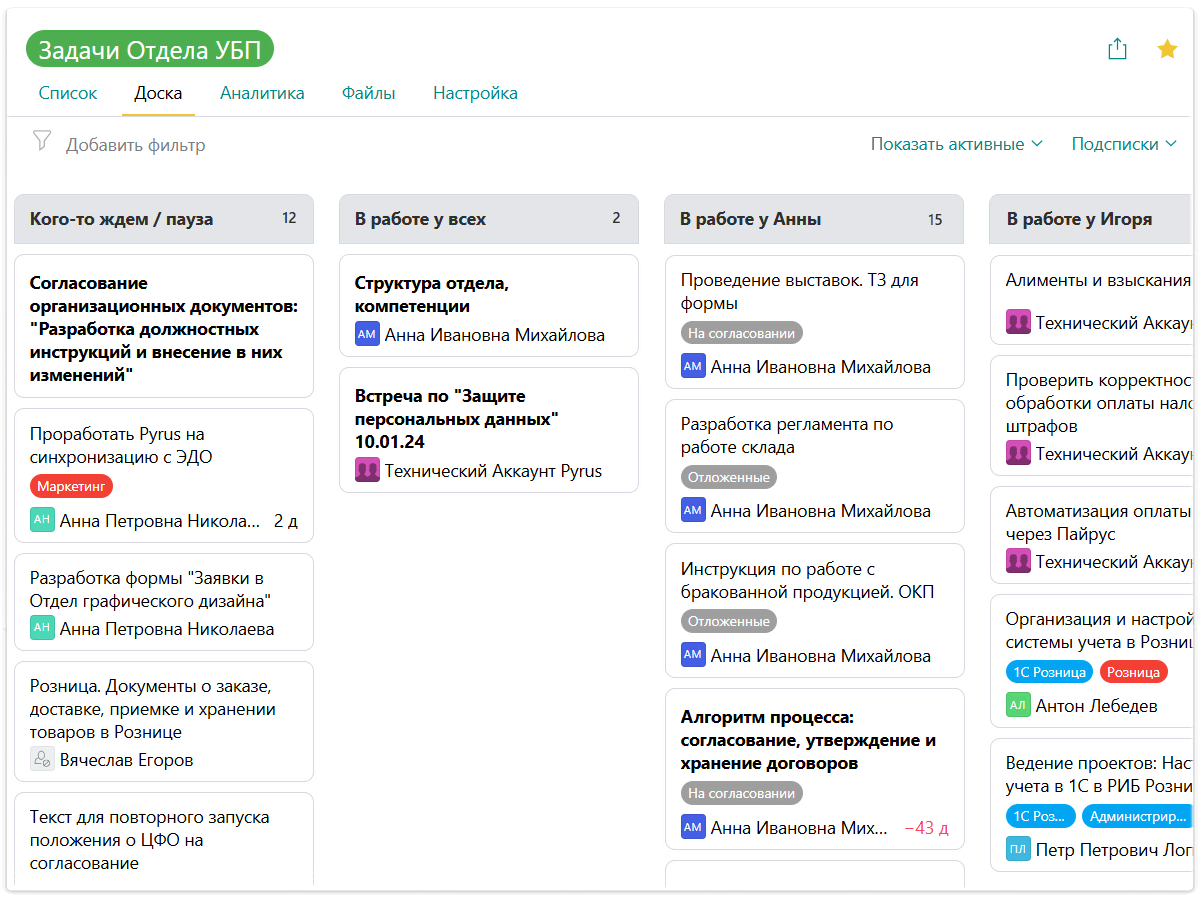 Все задачи в рамках проекта или отдела ведутся на канбан-доске, где наглядно отображаются статусы, объем работы в целом и по каждому сотруднику.