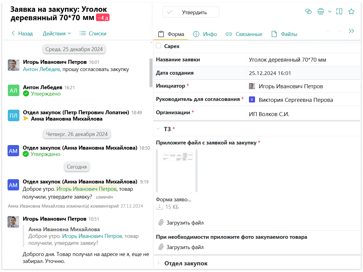 Маршрут процесса настроен гибко: например, если сумма превышает 50 тыс. рублей, к согласованию подключается юридический отдел. Если закупка касается мебели или оборудования, к задаче прикладывается спецификация и другие документы. Когда товар доставлен, ответственные сотрудники сравнивают его с описанием и ТЗ, прикладывая фотоотчет.