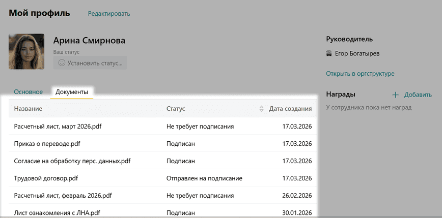 Если в вашей компании введен кадровый электронный документооборот Pyrus, все документы, подписанные сотрудником и организацией, могут отображаться в профиле, в одноимённом разделе.