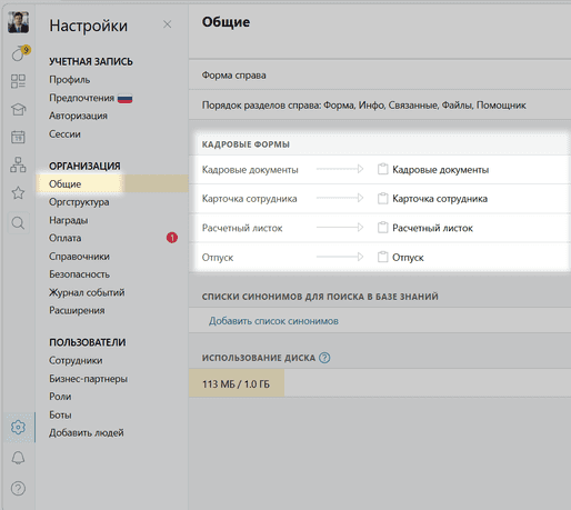 Чтобы список документов отображался в профиле, откройте общие настройки организации и укажите формы Pyrus для КЭДО — Кадровые документы и Расчетный листок, чтобы данные из этих форм подгружались в профиль. Для этого вам понадобятся организационные права Администратора либо расширенные права Управляющего пользователями.
