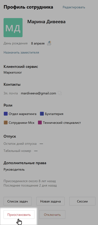 Иногда возникает необходимость временно ограничить доступ сотруднику доступ к задачам, процессам и данным компании в Пайрусе, например, на время проведения служебной проверки. При этом такой сотрудник остается в системе, все задачи, в которых он ответственный или участвуют остаются у него. Приостановить и восстановить доступ сотрудника к аккаунту можно на странице профиля.