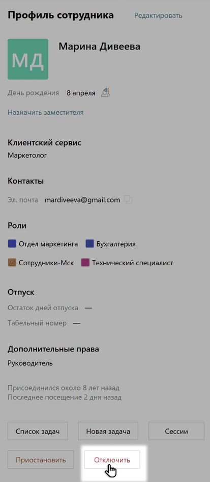 Примечание: если вы отключили сотрудников в Active Directory, после синхронизации их права доступа будут записаны как Доступ запрещен.Выберите, кого добавить в задачи заблокированного пользователя, и нажмите Отключить. Вся информация о задачах отключенного пользователя придет во Входящие выбранного сотрудника.
