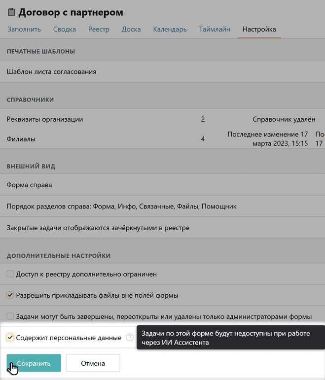 Если в форме Pyrus содержатся персональные данные, которые вы хотели бы усиленно защитить, можно ограничить использование ИИ именно в этой форме.