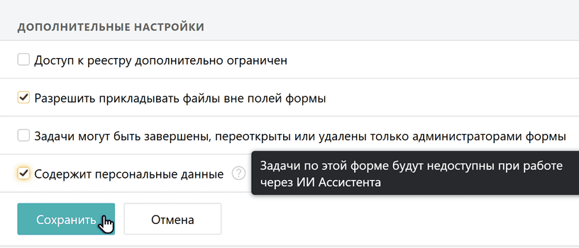 Также вы можете отключить искусственный интеллект при необходимости в настройках конкретной формы. В задачах, созданным по таким формам, ИИ-ассистент искать и анализировать информацию не будет.
