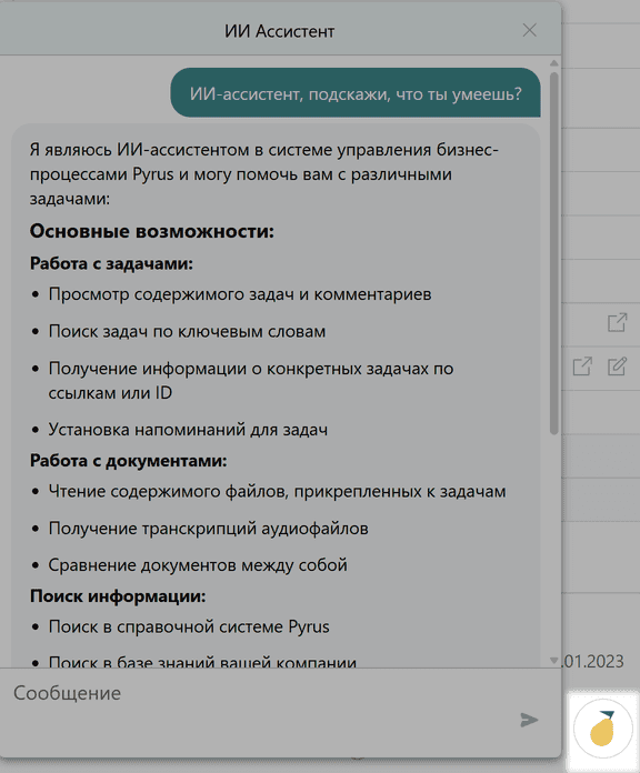 ИИ-ассистент Pyrus — это виртуальный помощник, который с помощью искусственного интеллекта в один клик помогает пользователям решать самые разные рабочие вопросы: находит нужную информацию по задаче; подсказывает варианты действий; готовит ответы и предложения клиентам, проверяет документы, напоминает о задаче в указанные дату и время, проверяет резюме кандидата на соответствие требованиям вакансии и др.