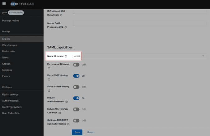 В настройках клиента, в разделе SAML capabilities установите для поля Name ID format значение email.