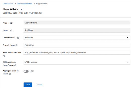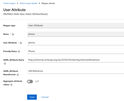 В Client Scope создайте мапперы типа User Attribute с полем SAML Attribute NameFormat в значении URI Reference для следующих атрибутов: