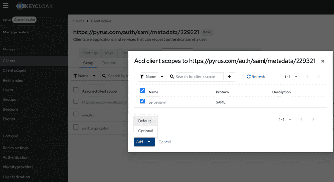 Войдите в раздел Clients, откройте вкладку Client Name, а затем — Client Scopes. Добавьте созданный вами ранее Client scope в статусе Default.