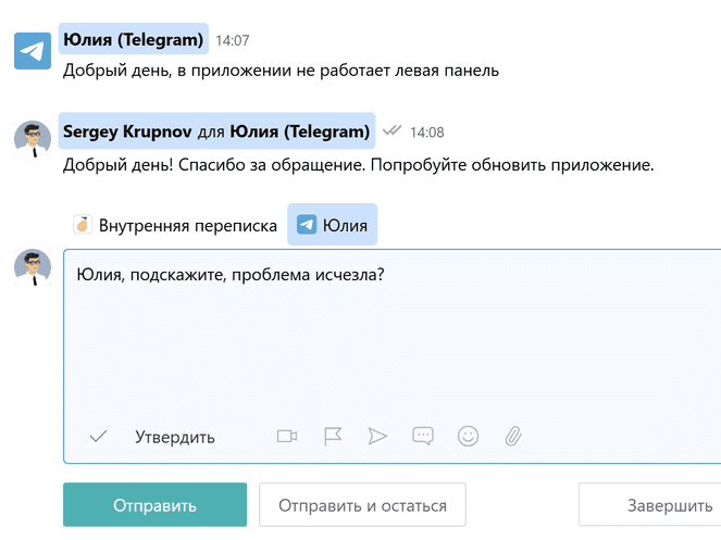 Как только в задаче будут заполнены все необходимые для начала общения поля, в сервис расширения отправится запрос POST /createdialog. В ответ на запрос сервис расширения должен вернуть channel_id и channel_name, после чего в задаче появится внешний канал для общения с клиентом.