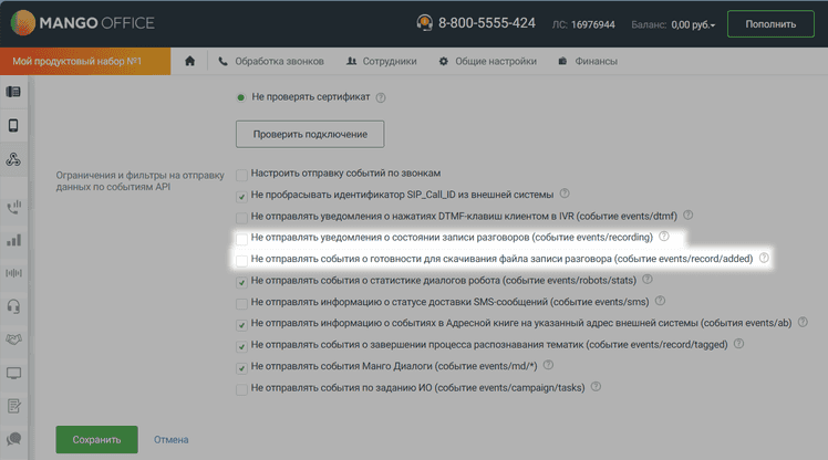 Подсказка: для корректной работы расширения проследите в личном кабинете АТС Mango, чтобы нужные уведомления не были отключены.