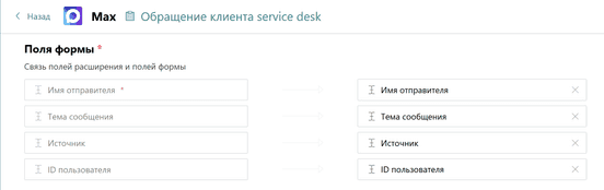 Укажите, в какие поля формы добавлять информацию из MAX: имя отправителя, его ID, тему сообщения и источник сообщения — название мессенджера.