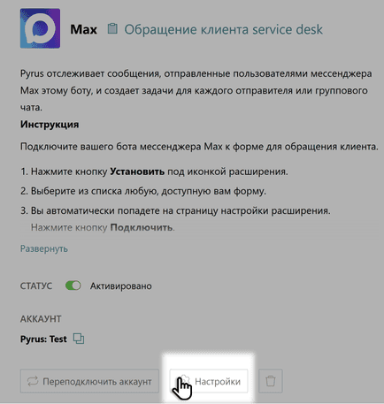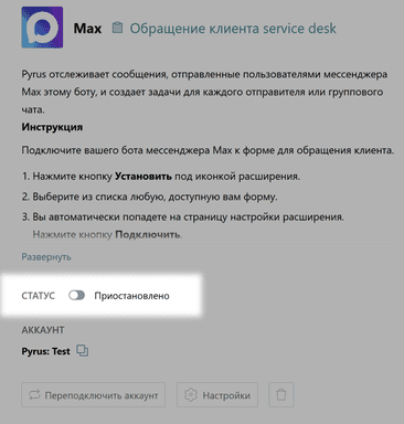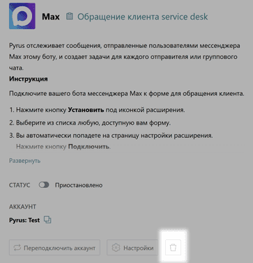 Если хотите приостановить работу бота MAX в форме Pyrus, на странице расширения MAX нажмите Приостановить.