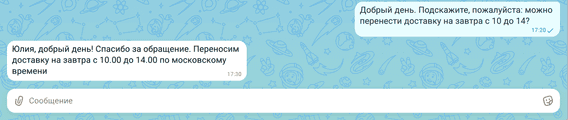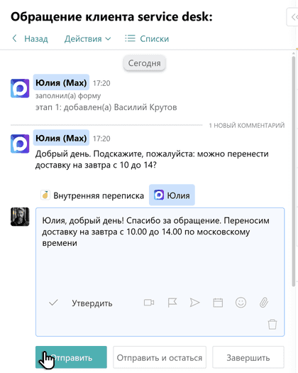 Обратите внимание: после отправки сообщения из заявки Pyrus в MAX одна галочка в поле ввода означает, что сообщение отправлено, а две — что доставлено. Информация о том, прочитано сообщение в MAX или нет, в Pyrus не отображается.