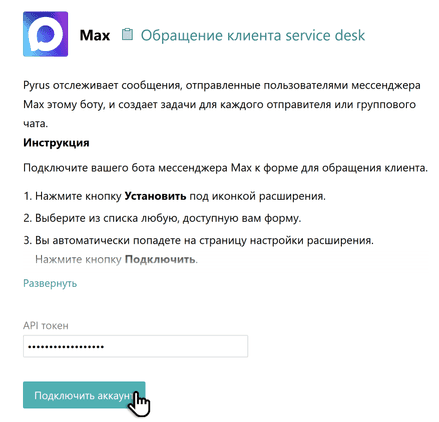 Введите API-токен бота, с которым будут общаться ваши пользователи в MAX и нажмите Подключить аккаунт.
