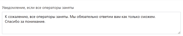 При превышении этого числа новые заявки перестают ему поступать, и будут распределены на тех операторов, у кого загрузка меньше. Если же загрузка превышена у всех, клиент получит сообщение о том, что сейчас все операторы заняты (текст такого сообщения можно задать на странице настройки расширения).