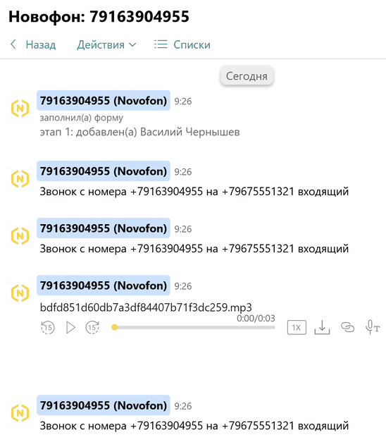 Подключите интеграцию Pyrus с облачной АТС Новофон для обработки большого числа телефонных обращений клиентов. Благодаря анализу аудиозаписей звонков вы сможете сократить время обслуживания и повысить его качество. Все входящие будут записаны, сохранены в облаке, а по завершении разговора их записи будут приложены в заявку Pyrus в виде комментариев.