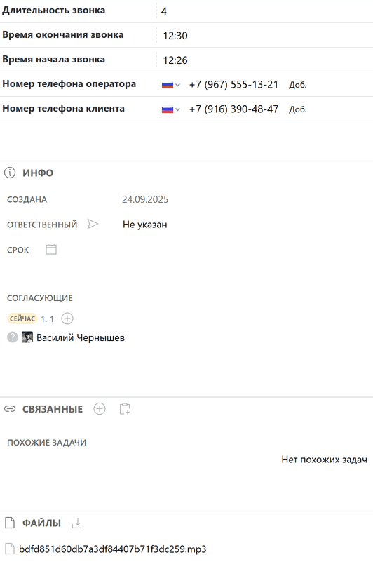 Если клиент звонит впервые, Pyrus определяет номер и фиксирует его в одновременно созданной заявке, которая оказывается во Входящих ответственного сотрудника. Если клиент обращается повторно, откроется уже существующая заявка.