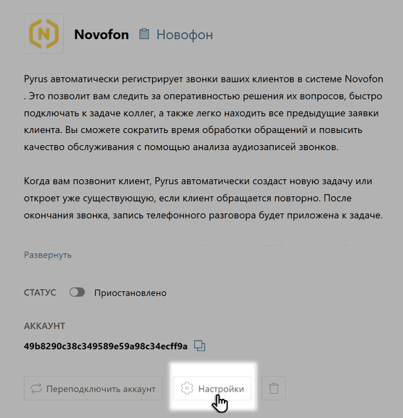 На странице настройки интеграции вставьте ссылку https://novofonintegration.pyrus.pro/zadarma/ и в ее конец добавьте добавьте ID аккаунта, скопированного в настройках расширения в Pyrus (шаг 9).