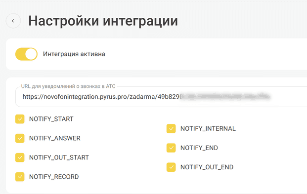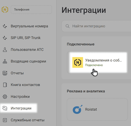 Вернитесь в личный кабинет Новофон, войдите в раздел Интеграции. Нажмите иконку Уведомления о событиях.