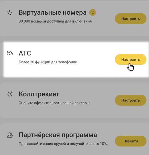 Если у вас нет собственной виртуальной АТС, создайте ее в личном кабинете: нажмите Настроить в соответствующем разделе.