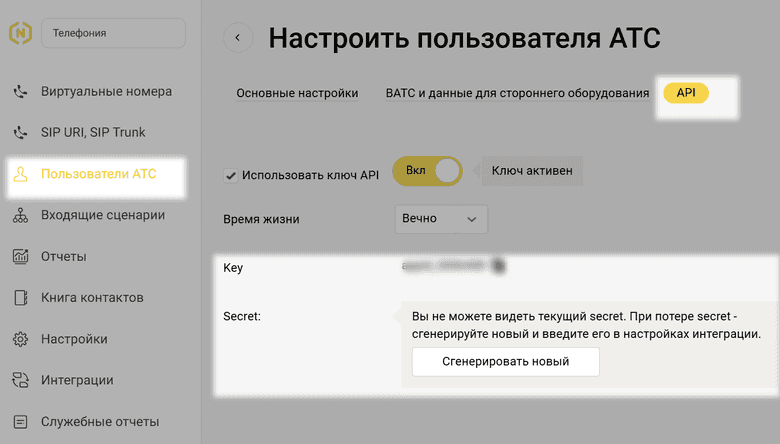 Для этого войдите в раздел Пользователи АТС, нажмите на нужного пользователя, а затем в его профиле откройте вкладку API. Скопируйте Key и Secret.