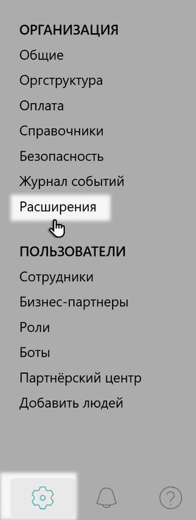 Нажмите на значок шестеренки в левом нижнем углу экрана, а затем откройте раздел Расширения.