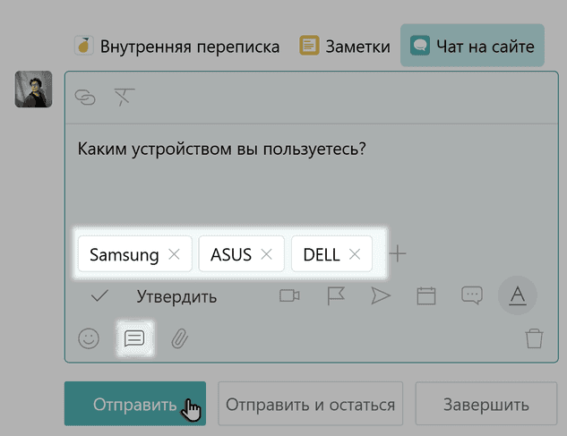 Предложите клиентам выбрать ответ простым нажатием на кнопку. Это удобно, например, когда клиент жалуется на некорректную работу приложения и оператору поддержки важно знать, на каком оборудовании это приложение установлено.