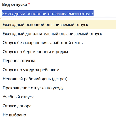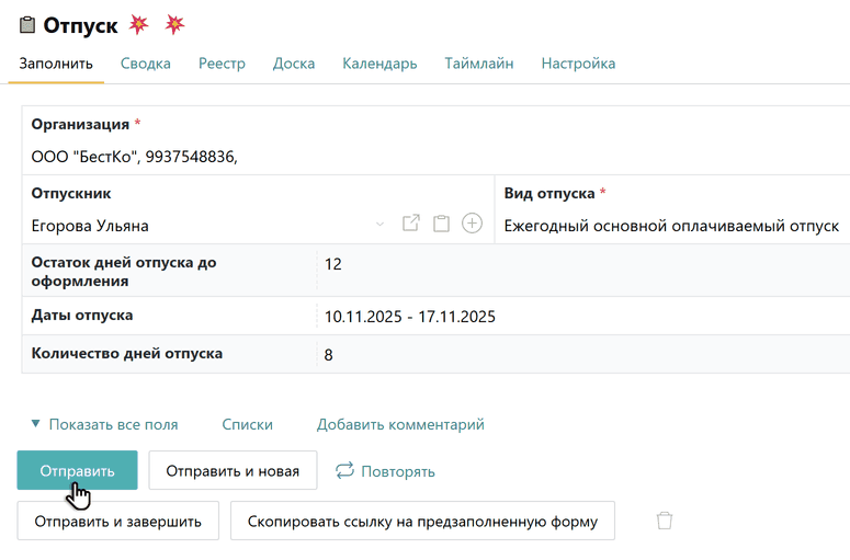 Работник авторизуется в Pyrus, заходит в нужную форму и выбирает вид документа, который планирует отправить. Например, для отправки заявления на отпуск ему нужно выбрать тип отпуска, указать его продолжительность, заполнить необходимые данные и нажать кнопку Отправить.