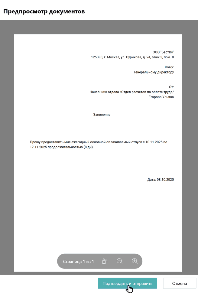 Pyrus формирует прямо в заявке PDF-файл с заполненным заявлением, сотрудник может с ним ознакомиться и отправить на согласование. Для этого нужно нажать на кнопку Подтвердить и отправить.