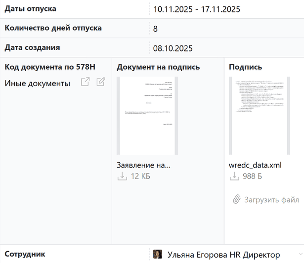 В заявку автоматически загружается PDF-файл с документом и отдельно — файл с подписью сотрудника в формате wredc_data.xml в соответствии с Приказом Минтруда РФ №578Н.